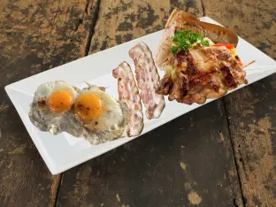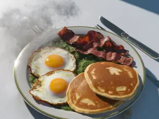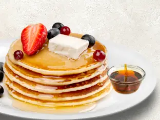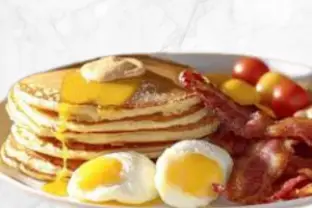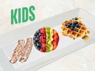 2 cage-free eggs any style with Belgian waffle or a multigrain pancake. With your choice of meat bacon, smoked ham, chicken apple sausage patties, turkey or pork sausage links.