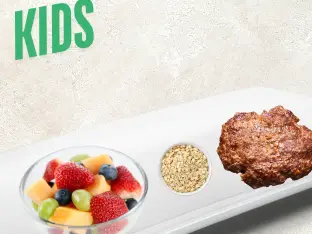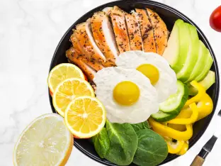 Rich Protein quinoa seed with sausage. A portion of veggies with lemon and also two eggs cooked on your preference.