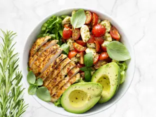 Salad contain cheese, chicken breast and a portion of salad greens, avocado and also bacon.